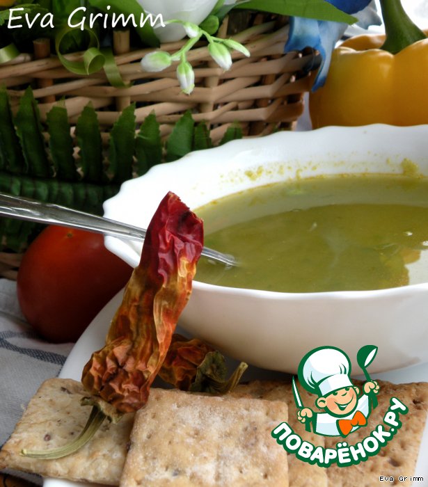 И сделаем в блендере пюре, смешаем с получившимся куриным бульоном, добавим соль и специи по вкусу