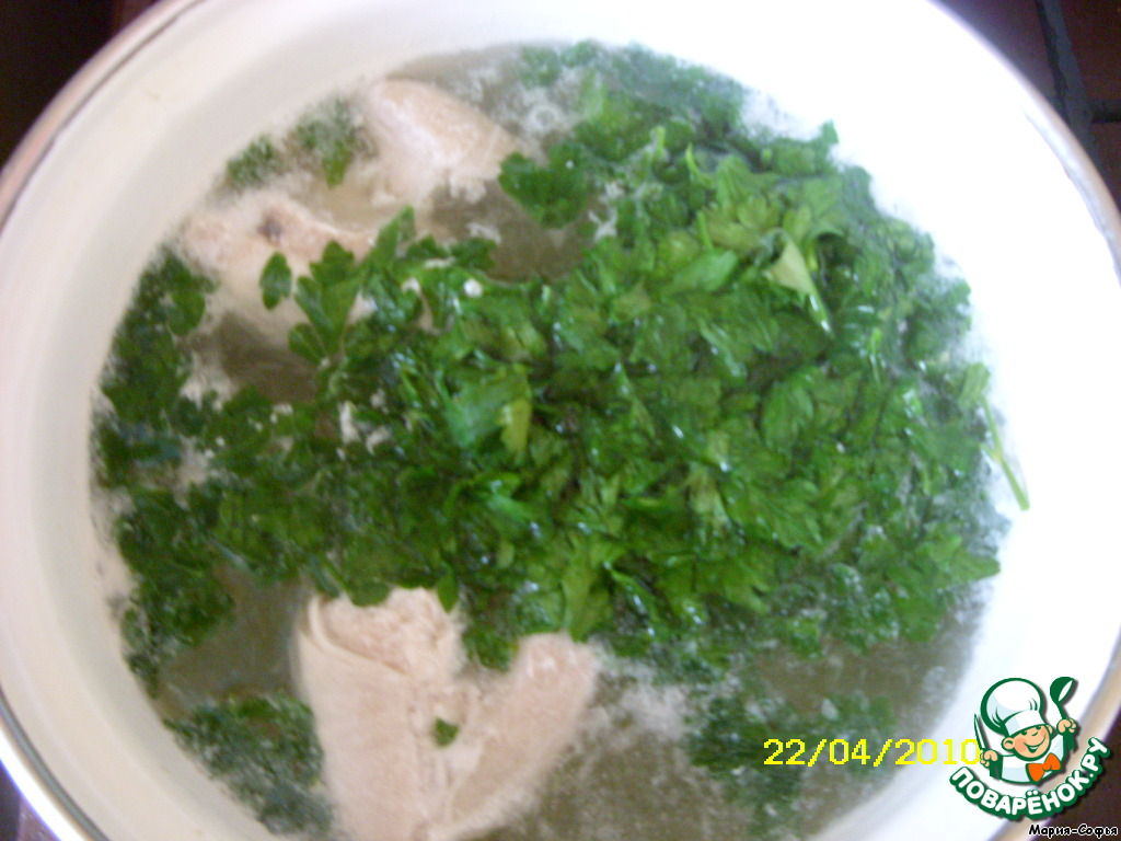 Отварить куриную грудку в подсоленной воде, когда грудка будет почти готова, добавить петрушку.