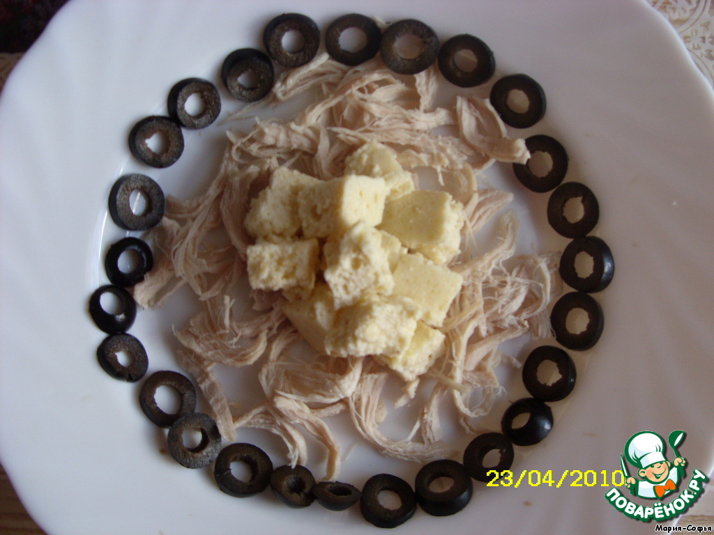 Волокна курицы выложить в тарелку, сверху горкой кубики, по краям украсить маслинами.