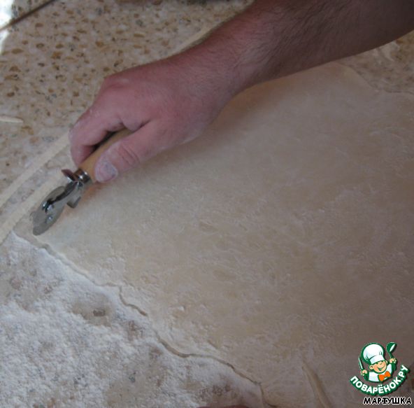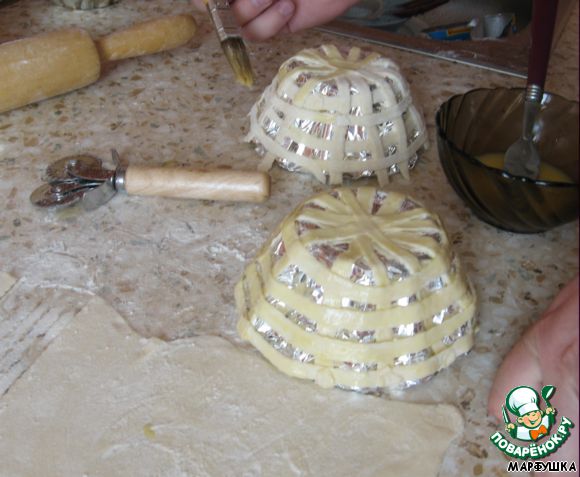 Затем так. И смазал аккуратно взбитым яйцом - надо смазать так, чтоб не попало на фольгу, иначе прилипнет тесто к фольге.