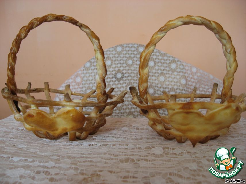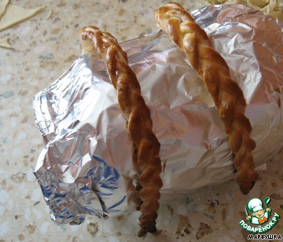 Из теста сплел косичку (я подсказала немного) - ручку для корзинки и тоже в духовку (чтобы получилась форма ручки 1 литровую банку обернул фольгой и положил на нее косичку).