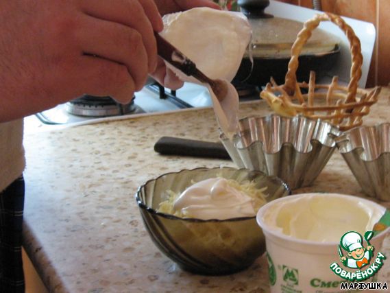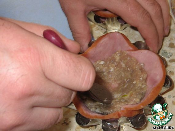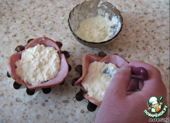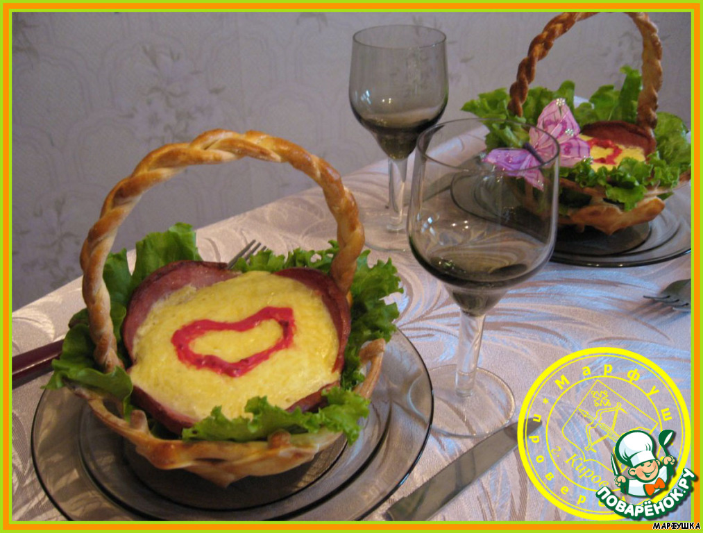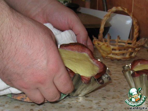 Убрал ручку, выложил дно корзинки листьями салата, сверху поместил "чашечку" из ветчины.