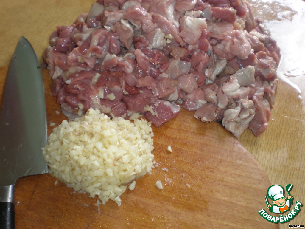 Измельчаю чеснок, смешиваю с мясом, добавляю примерно 1 ч.л. соли и перца,