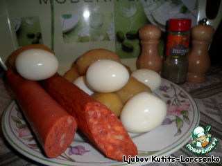 Предварительно можно отварить колбаски, чтобы удалить лишний жир, и обязательно снимаем с них кожуру. Толщина нарезки ингредиентов, конечно, может зависеть от вашего желания, если хотите сделать 2-3 слоя - режьте картофель, яйца и колбаски толщиной 1 см; если хотите увеличить кол-во слоёв - режьте тоньше, примерно 0,5-0,3 миллиметра.