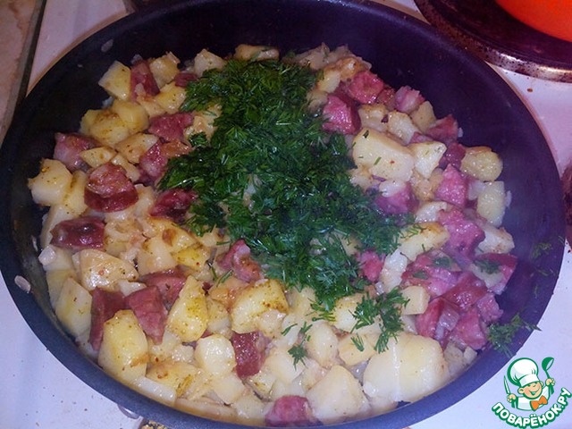 Добавляем колбасу и на сильном огне обжариваем до золотистой корочки.