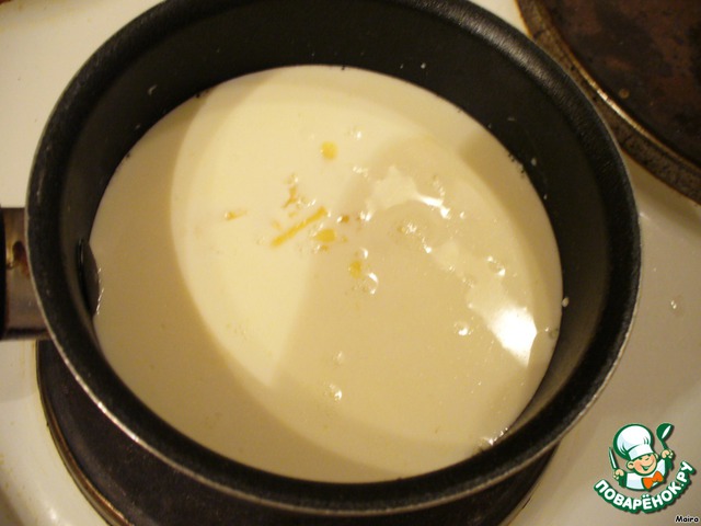 Готовим соус. Масло растопить, добавить муку, слегка обжарить. Ввести сливки, довести до кипения. Добавить тертый сыр, посолить, поперчить. Нагревать, пока сыр не расплавится.