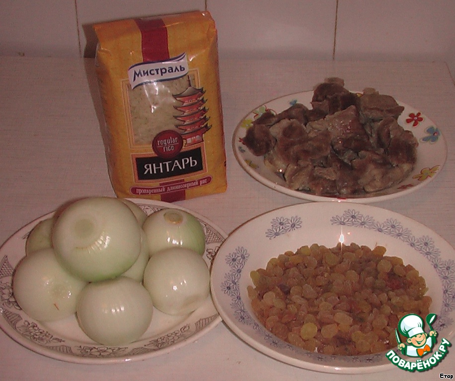 Пока варится рис, к луку добавляем мясо, изюм и приправу (соль, перец, имбирь, сахар), обжариваем вместе. Снимаем с огня и положим в сторонку.