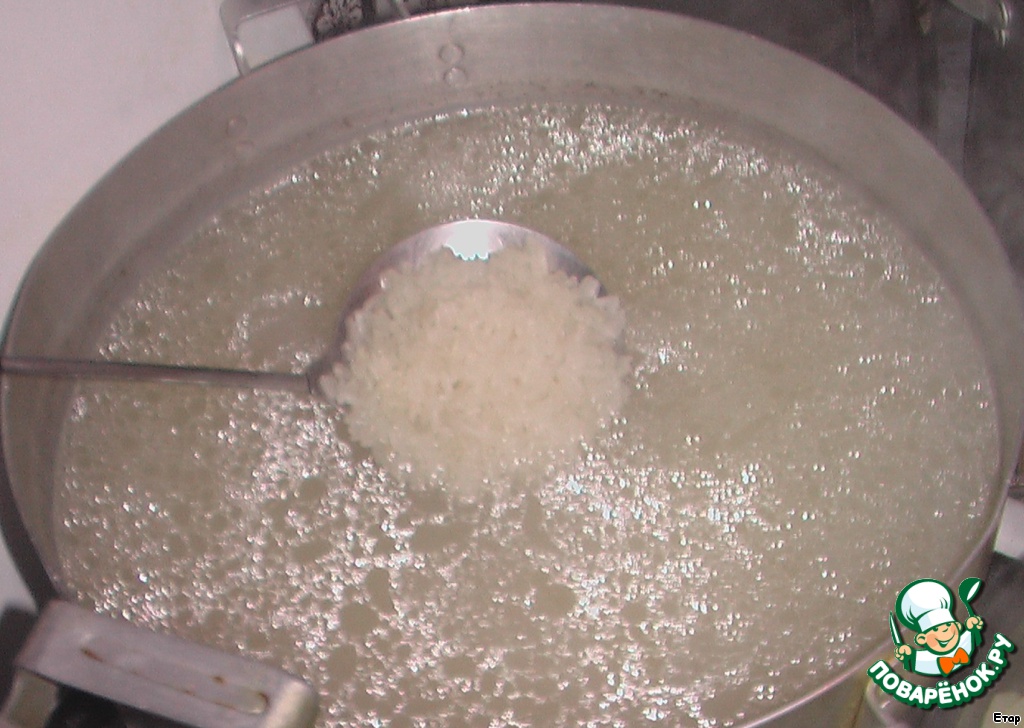 К бульону добавим воды и кипятим. Варим рис в подсоленной воде до полуготовности.
