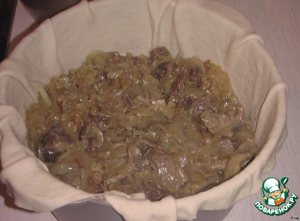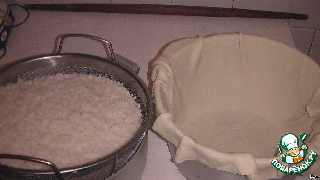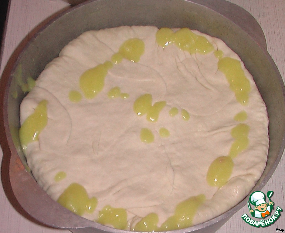На кастрюлю выложим наше раскатанное тесто, да так, чтобы края теста свисали.