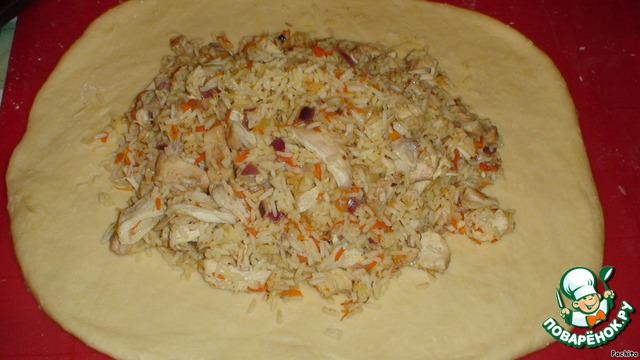 На гладкой поверхности раскатываем тесто толщиной в 1 см., выкладываем начинку из плова, поднимаем края и защипываем.