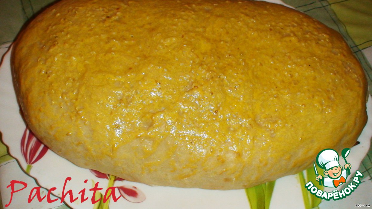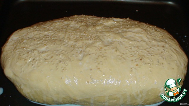 Верх смазываем взбитым яичным желтком с молоком, посыпаем кунжутом и ставим в разогретую духовку.