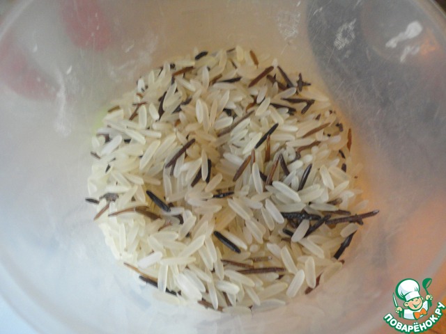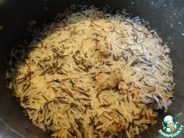 Теперь два слова о рисе. В плове он должен быть рассыпчатым. Для этого необходимо выбирать сорта риса с низким содержание крахмала. Внешне такой рис не молочно-белый, а слегка прозрачный. Обычно я беру "Басмати" или "Жасмин". Сегодня у меня была смесь пропаренного "Басмати" и дикого риса. Идеальные пропорции: воды должно быть в 1,5 раза больше, чем риса. Именно, поэтому, я в ингредиентах рис указала в миллилитрах, а не в граммах.