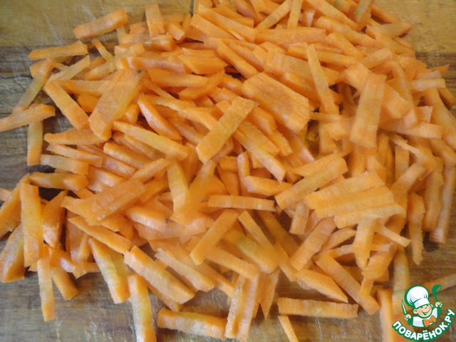 Теперь еще один важный момент. Морковь необходимо нарезать соломкой, а не натереть на терке. Почему так, тоже станет понятно ниже. А еще, моркови должно быть МНОГО! Она дает плову сочность и своеобразный вкус!