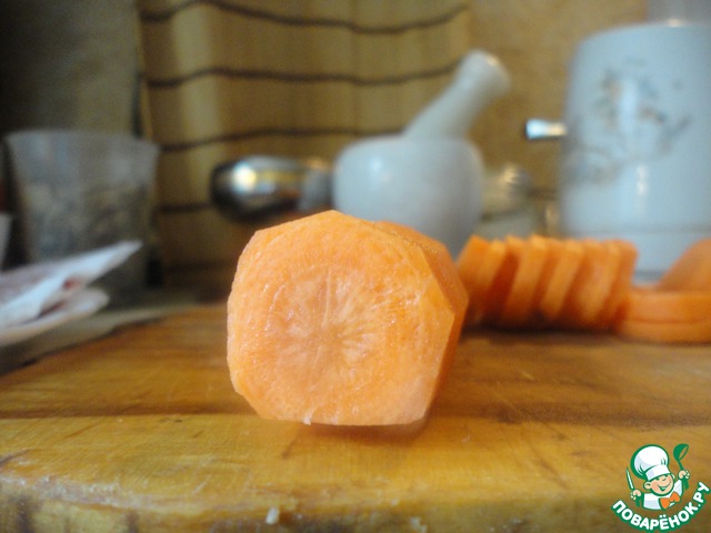 Теперь маленький мастер-класс по нарезке моркови. С почищенной моркови, чтобы она не "каталась" при нарезке, срезаем с одной стороны тонкую полоску и морковь с одной стороны станет плоской. Ну вот так морковь будет смотреться в разрезе. Нарезаем морковь сначала кружками толщиной примерно 3 мм.