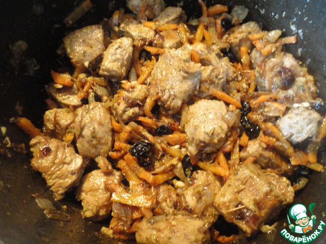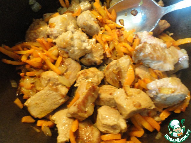 Традиционный плов готовят на растопленном животном жире. Обычно - на бараньем, у нас (европейская часть СНГ), как правило, делают плов со свининой, и соответственно берут сырое сало. Но для моей семьи это слишком тяжело. Муж и я стараемся следить за своим весом, а у доци есть проблемы с почками, поэтому, несмотря на отличный обмен веществ, очень жирного ей нельзя. Я готовлю на растительном масле. Хорошо разогреваем сковороду, наливаем масло. Маленькими порциями на сильном огне очень быстро обжариваем мясо со всех сторон до золотистой корочки. Именно ради этой корочки я и обсушивала салфеткой мясо. Если этого не сделать, то мясо может пустить сок и корочка не получится. ВАЖНО - МЯСО НЕ СОЛИТЬ! Соль также способствует выделению сока.