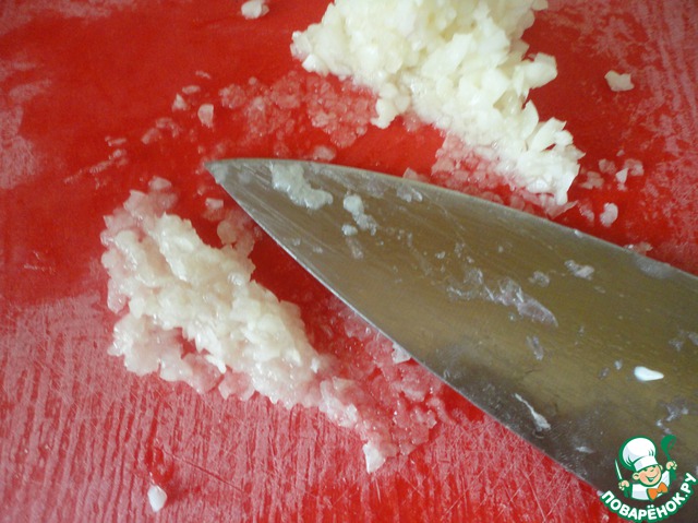 Вот еще одно отступление от традиционного рецепта, которое делает плов не менее вкусным. Принято в насыпаный на мясо и морковь рис вставлять целую, неочищенную головку чеснока и таком виде варить. Это конечно красиво, но запаха и вкуса чеснок меньше отдает плову. Я предпочитаю поступать по-другому. Чеснок перетираю ножом с солью (можно пропустить через пресс для чеснока) и добавляю к мясу с луком и морковкой. Если готовите плов на праздничный стол, то, кроме чеснока к мясу, можно и целую головку традиционно в рис воткнуть, чтобы ее потом красиво воодрузить на верхушку плова на блюде.