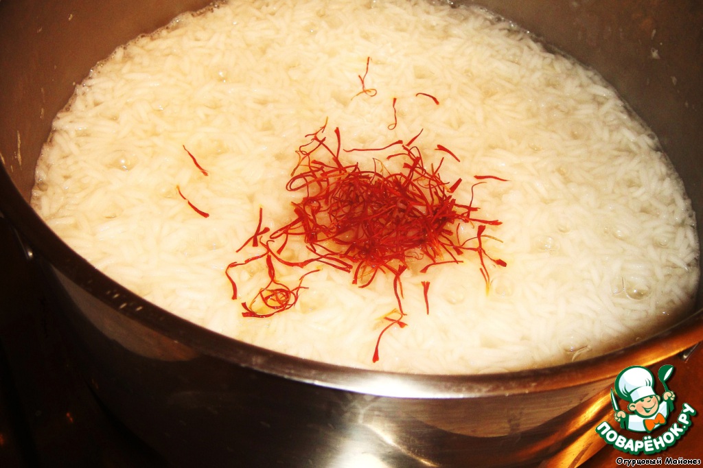 Для начала варим рис. У каждого из вас наверняка есть свой способ приготовления рассыпчатого риса. Я готовлю максимально просто: заливаю промытый рис кипятком (в объёме в 2 раза большем, чем объём риса), довожу до кипения, убавляю огонь и накрываю крышкой. Минут через 15 рис впитает всю воду и будет готов. В данном блюде за 5-7 минут до готовности риса всыпаем в него шафран и перемешиваем.