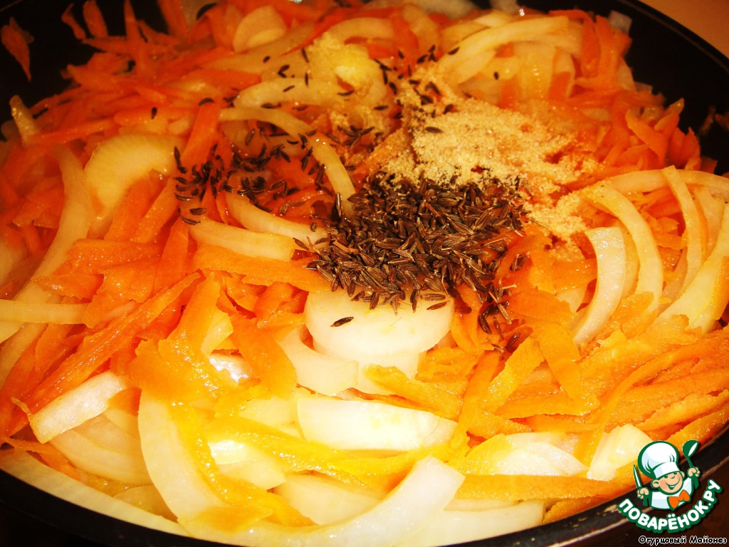 На сковороде с щедрым количеством оливкового масла обжариваем морковь (натёртую на крупной тёрке) и нарезанный полукольцами репчатый лук. Добавляем к зажарке зиру, кумин и сухой молотый чеснок.