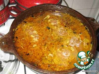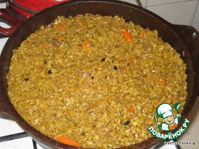 Теперь, когда зирвак закипел, засыпаем рис. Рис должен быть хорошо промыт в ХОЛОДНОЙ воде. Рис должен быть покрыт зирваком на пол-пальца. Выпиваем.