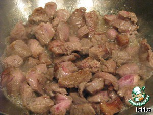 Выкладываем мясо, мгновенно обжариваем его до румяной корочки, добавляем кипяток, закрываем крышкой и тушим до готовности