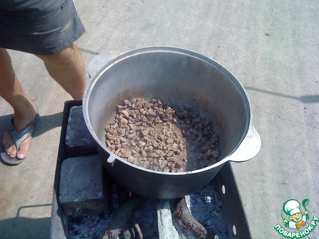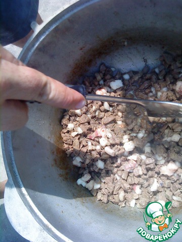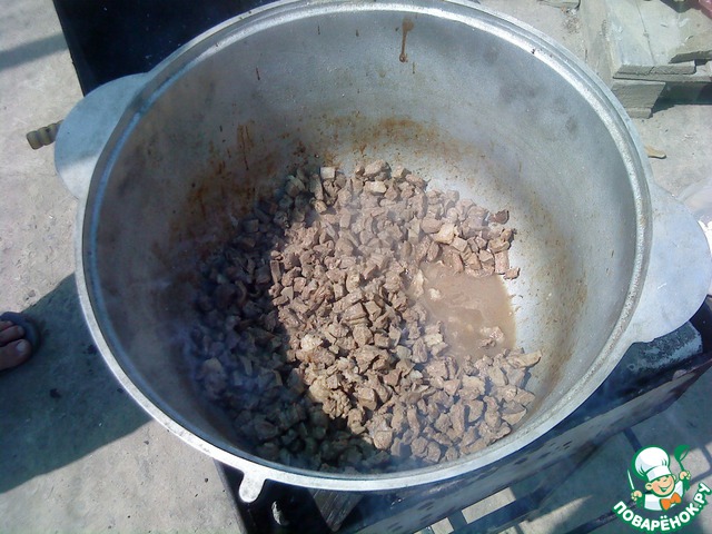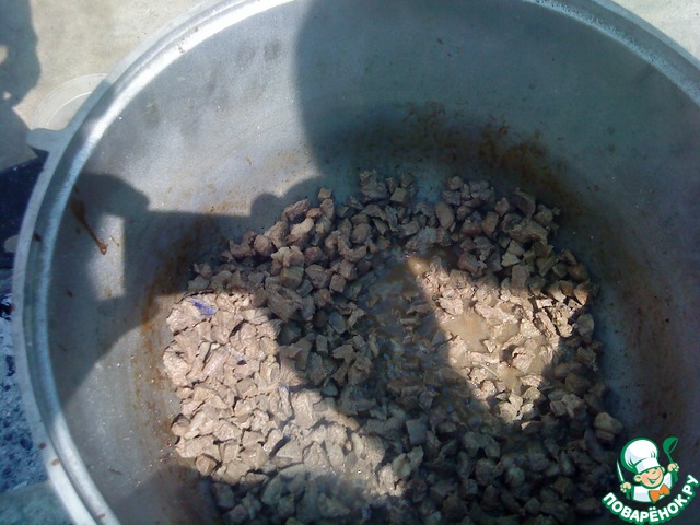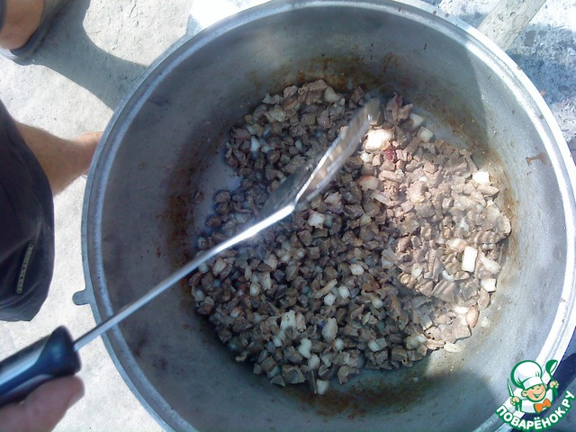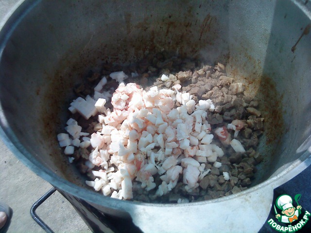 Добавляем сало (курдючный жир), всё мешаем, чтобы не пригорело, постоянно и неустанно.