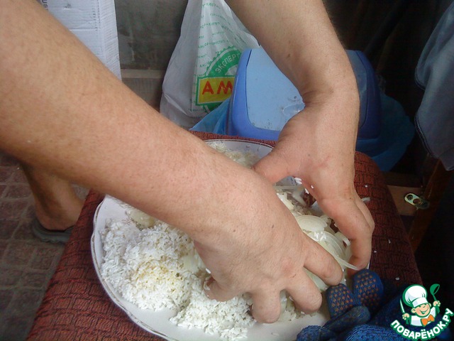Так... готово - высыпаем рис с луком в казан и... правильно - мешаем!
