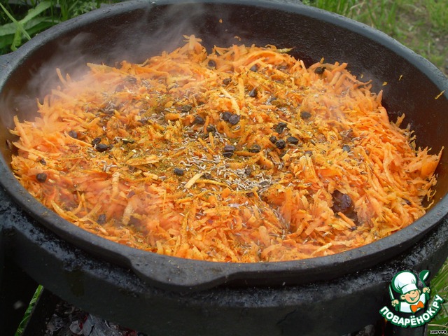 Затем выкладываем морковь (лучше, конечно, нарезанную соломкой, но я тру на крупной тёрке), сверху посыпаем специями - зирой, приправой для плова (если в составе приправы нет барабариса, то и им тоже), солим, перчим и ни в коем случае не перемешиваем. Ждём, когда морковь подрумянится.