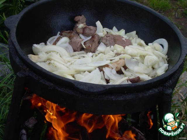 Налить в казан растительное масло, раскалить его на огне, готовность масла проверить бараньей ножкой - положить её в масло и ждать, когда масло вокруг ножки начнёт шипеть и пузыриться. Как только масло накалилось, закладываем крупно порубленные куски баранины (лучше молодой), обжариваем до румяной корочки, добавляем нарезанный полукольцами репчатый лук и тоже обжариваем.