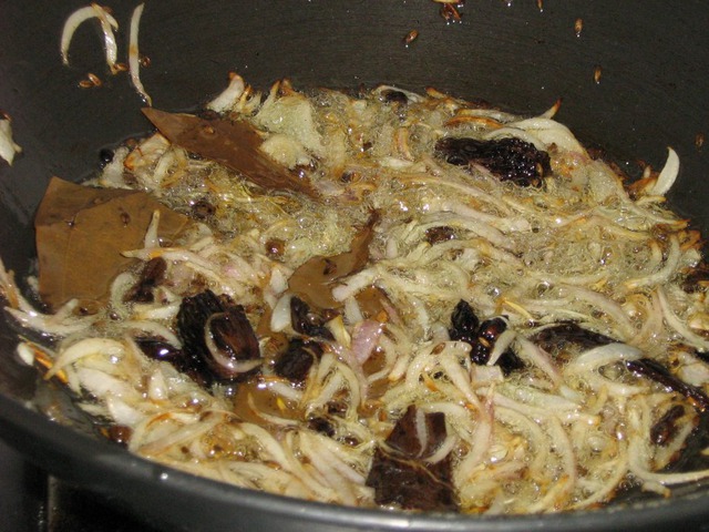Разогреваем сковороду с маслом, сначала слегка обжариваем кешью, вынимаем на салфетку. Обжариваем зиру 1 мин, кладём все остальные цельные специи, обжариваем ещё 2 мин. Кладём лук, жарим до золотистости.