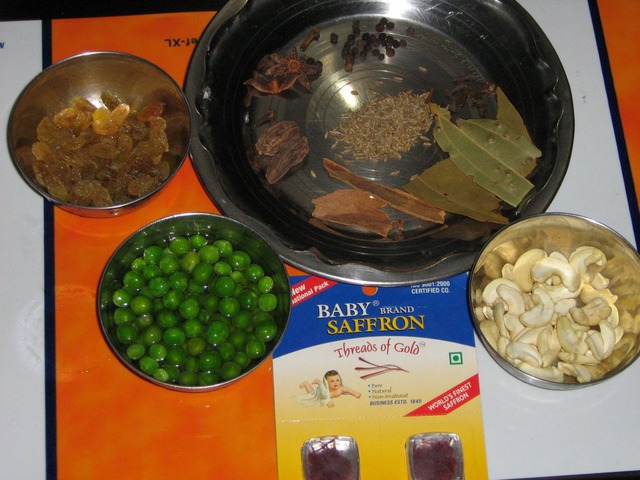 Рис промываем, замачиваем на 30-40 мин. Подготавливаем специи, горошек( у меня был замороженый), орехи, замачиваем изюм.