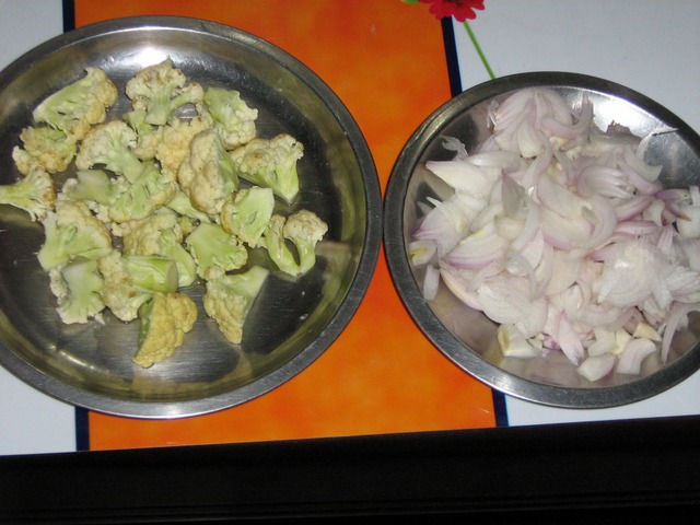 Режем лук, морковь, цветную капусту на мелкие соцветия.