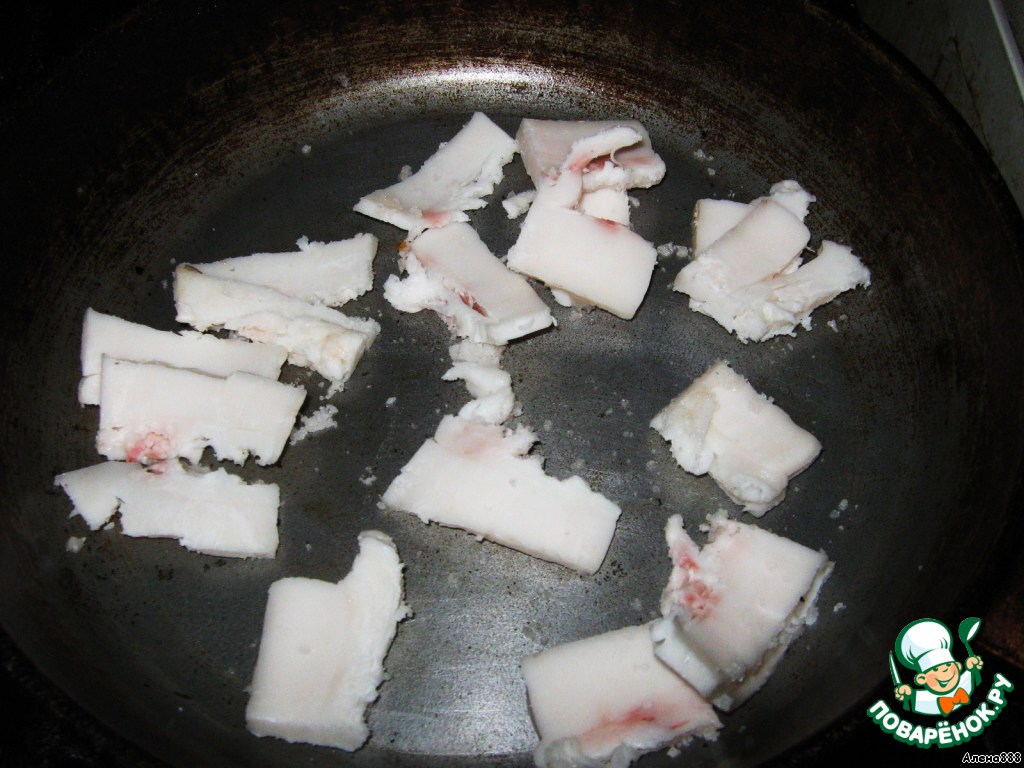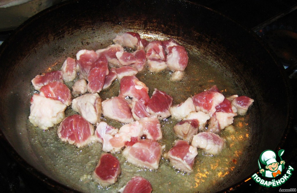 На полученный на сковородке смалец выкладываем нарезанную свинину.