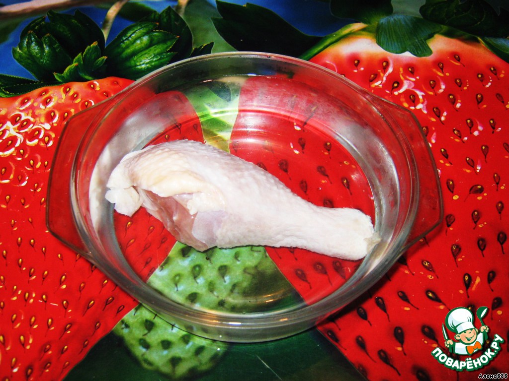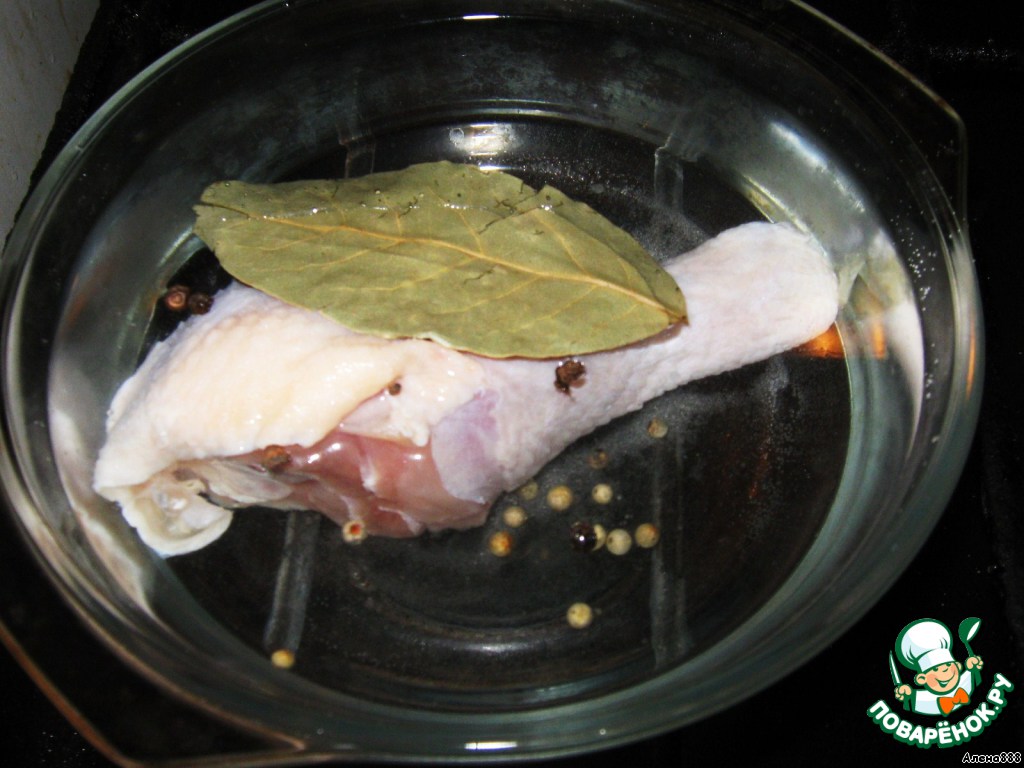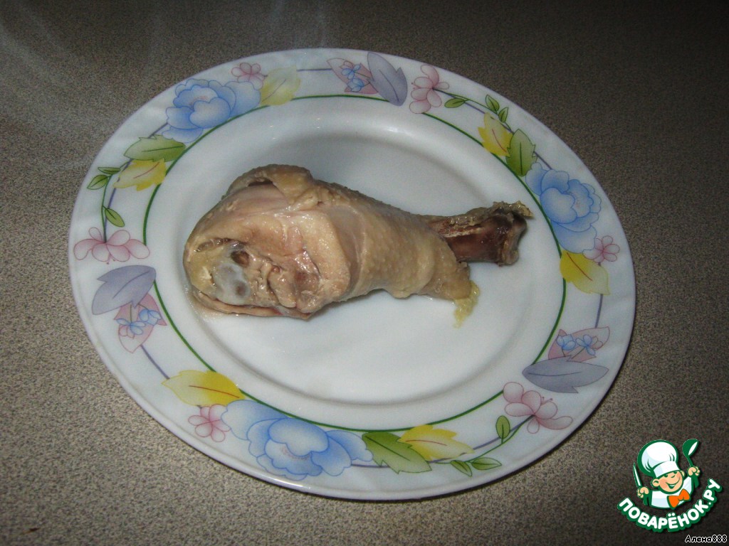 Куриную голень ставим немного приварить, чтобы стала мягкой, минут на 10.