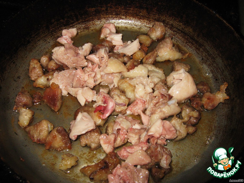 Выкладываем нарезанное куриное мясо на сковородку к поджаренной свинине.