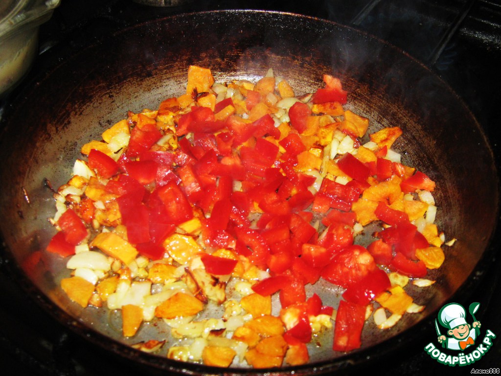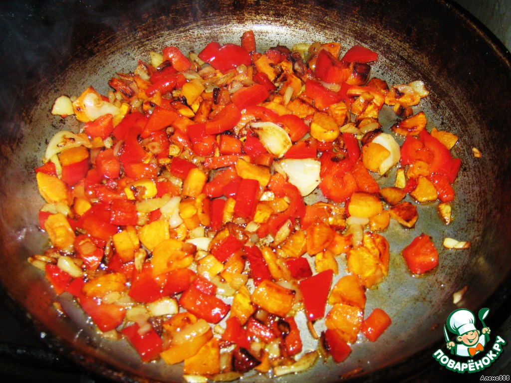 Затем на пару минут выкладываем к овощам болгарский перец.