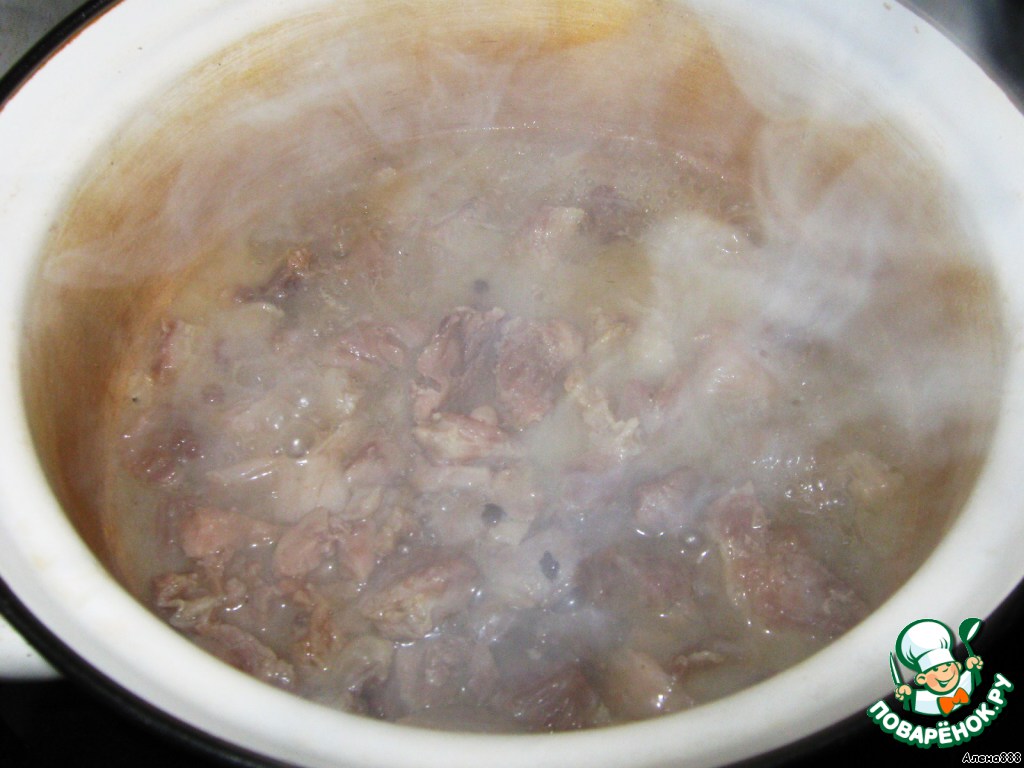 Когда свинина уже хорошо поджарится, вынимаем из бульона приваренную куриную голень.