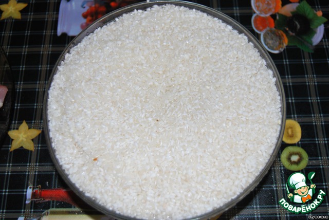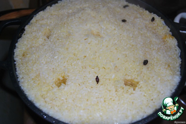 тут же кладем рис (предварительно влив из него воду) и заливаем кипятком, в котором растворяем оставшиеся 3 ч.л. соли, на 1-2 см над рисом, ждем когда вода выпарится, делаем в рисе дырочки до дна и накрываем крышкой. Тушим минут 40-60, до готовности риса.