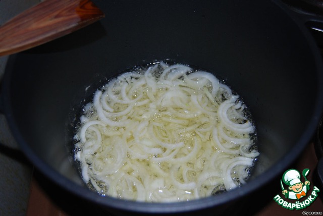 Казан ставим на огонь (в моем случае казан на 5 литров), наливаем масло. разогреваем. добавляем лук и обжариваем до золотистого цвета