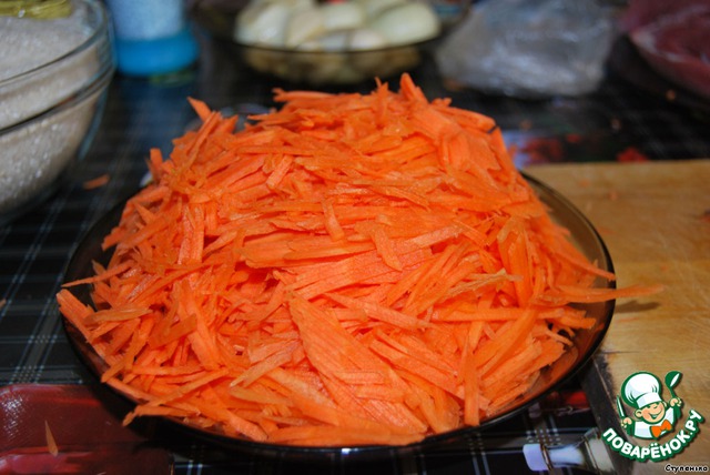 кладем морковь, перемешиваем, заливаем горячей подсоленой водой так, чтоб морковь была чуть скрыта. (из расчета 1 ч.л. соли на 1 стакан риса) в данном шаге кладем 1 ч.л. соли, разбавленной в воде. тушим минут 15