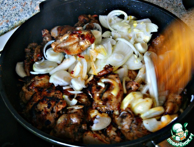 Хорошо обжариваем до золотистой корочки, добавляем лук. Снова обжариваем, помешивая.