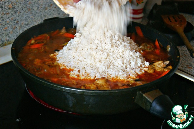 Добавляем морковь, жарим. Всыпаем рис, хорошо перемешиваем, добавляя соль и приправу.