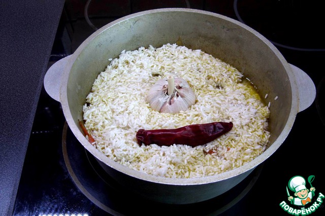 Увеличиваем нагрев. Добавляем рис, головку чеснока, стручок перца (если он не имеет повреждений кожицы, то никакой страшной жгучести плову он не придаст). Добавляем остаток соли.