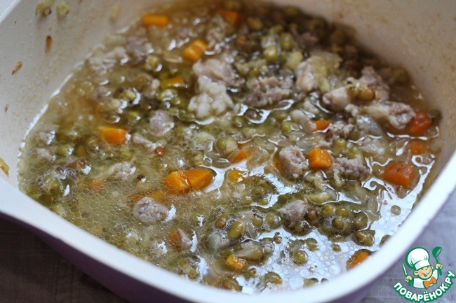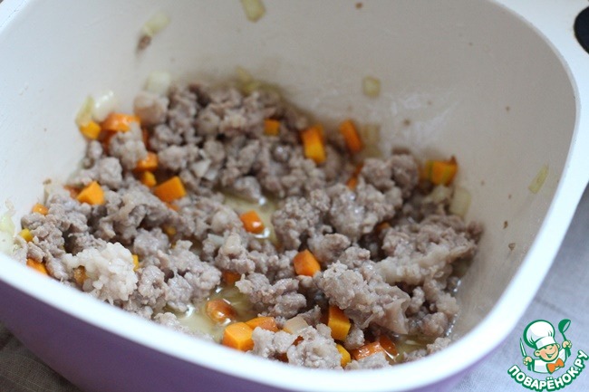 Лук нарезать, обжаривать на растительном масле или прокаленном жире. Мясо (у меня свинина) мелко нарезать («воробьиные язычки») или измельчить на крупной мясорубке, добавить к луку. Морковь кубиками и к поджарке. Обжаривать до золотистого цвета.