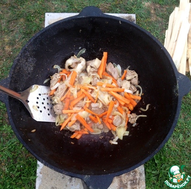 После чего положить в казан нарезанную морковь, желательно тонкими полосками. Обжаривать на жиру с мясом и луком еще мин.10, Прермешивая.