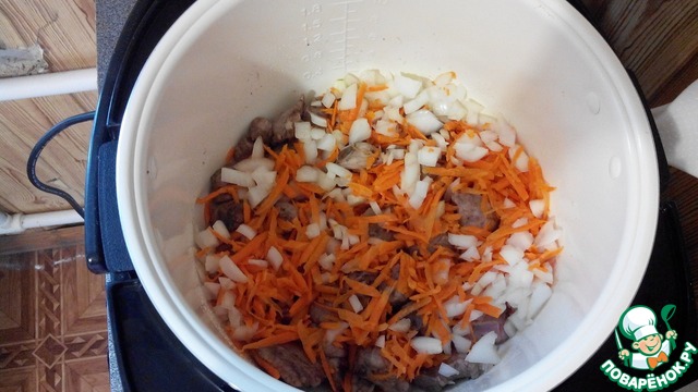 Мясо режем кусочками ( мне нравится побольше), в мультиварку наливаем немного растительного масла, ставим режим жарка (160 гр.) на 15 минут