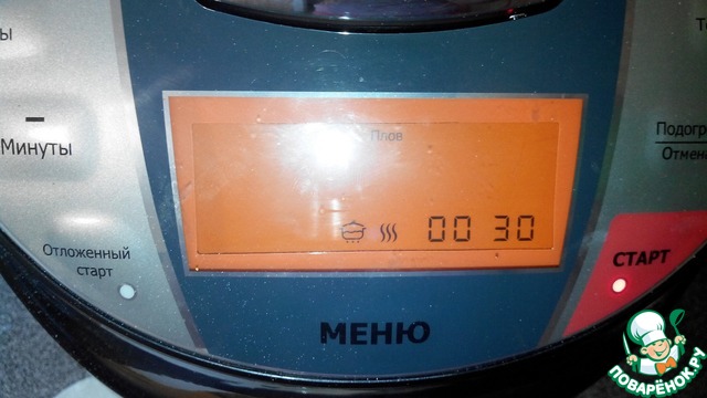 Поставим на режим плов на 30 минут (больше не нужно) и выключим функцию подогрев, чтобы рис не разварился и был рассыпчатым