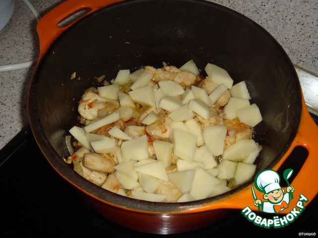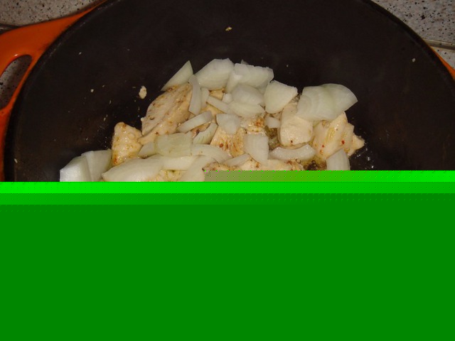 Обжарить куриное филе и добавить лук, жарить до золотистого цвета.