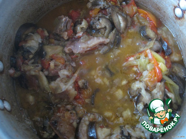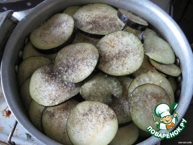 баклажан кружками,солим перчим. На средний огонь под крышку,на 2 часа, не открывать. Через час огонь убавить до минимума.