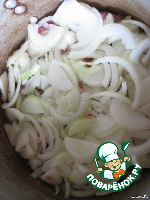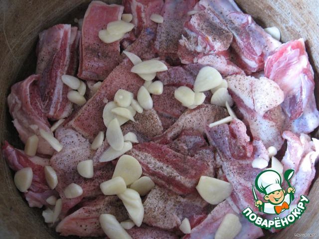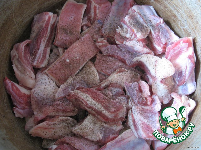 В идеале нужно на дно выкладывать нарезанный лепестками баранье курдючное сало,а уже сверху мясо нарезанное как на плов. Каждый слой солим,перчим