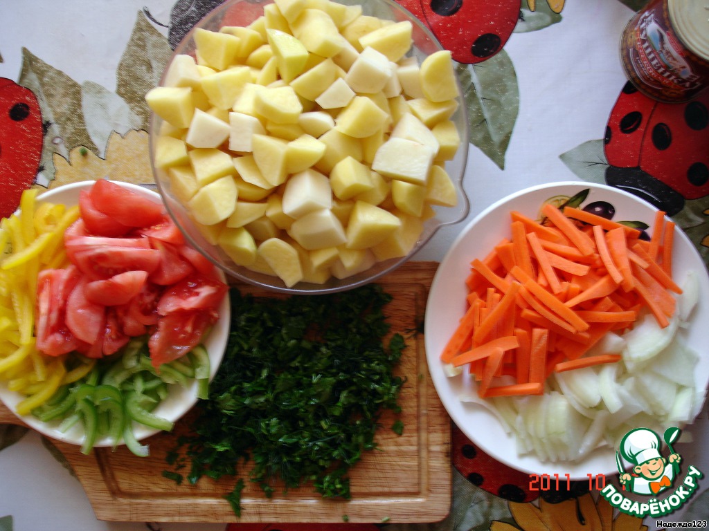 Нарезаем картофель кубиком, перец и морковь - соломкой, лук полукольцами, помидоры (без кожицы) дольками, зелень измельчить.